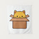 Playful cute and funny orange cat sitting inside cardboard box smiling