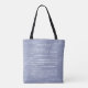A bag with a drabble (100 word short story). The front has an outline of a cat made from fragments of the story. The back has the story. The text is white on a light blue background.