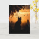 A sympathy card for the loss of a beloved cat, showing a tranquil sunset casting a warm glow over the silhouette of a graceful feline as birds drift peacefully across the sky.