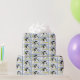 Black and white tuxedo cat tangled up in toilet paper on a white tile bathroom floor with a blue, white and yellow rubber ducky bath mat under the tuxedo cat.