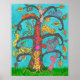 The Tree of Life, a tree with many branches, is an archetypal recurring theme in many world cultures signfying the interconnectedness of all life on our planet. It appears in artwork, theology, philosophy and mythology worldwide. This colorful version features color leaves,whimsical bark patterns, and numerous multicolored cats in action poses, each covered with unique colorful markings reminiscent of those found on painted Oaxacan animal carvings.