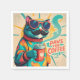 Retro-style cartoon cat wearing oversized sunglasses, holding a coffee cup. Bold 80s-inspired colours (teal, mustard, coral) with a halftone texture background with Playful slogan like ‘Paws for Coffee’ in a vintage script font."