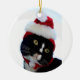 Cat wearing santa hat photograph, BW kitty Ceramic Tree Decoration