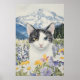 A stunning illustration of a black-and-white cat with striking heterochromia—one golden eye and one blue—surrounded by vibrant wildflowers in yellow, purple, and white. The majestic mountain range in the background and lush greenery complete this captivating and peaceful scene.