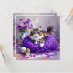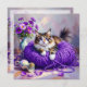 A blank card with a sweet kitty cat sitting on a ball of purple yarn and next to a purple vase of flowers.
