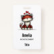 Name badge with a whimsical drawing featuring a big orange red kitty cat.