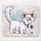 A fluffy, white, cartoon cat carries her toy mouse in her mouth, ready for more play! This cute design was created with watercolor and ink.