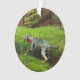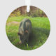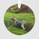 The Catahoula dog spies the wild hog in the forest and starts barking loudly at the wild hog from a safe distance. The Catahoula is on one side of the ornament, while the hog is on the opposite side.
