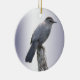 This ornament features a Grey Catbird perched on a fence post.. He is a grey bird with a black cap and bright rusty feathers under the tail. Grey Catbirds are relatives of mockingbirds and thrashers, and they share that group’s vocal abilities, copying the sounds of other species and stringing them together to make their own song. Their call sounds like the meow of a cat.