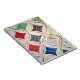 Close up of old cathedral window quilt pattern with needle and red thread.