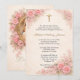 Featuring a beautiful Catholic custom designed Baptism Christening Floral invitation with the Blessed Mother holding Jesus in her arms inlaid in a gold frame with pink roses floral design. All text and fonts may be modified.