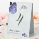 Catholic Misty Blue and Green design features a lovely misty-blue background to three purple roses in top corner. Your heading and table number are displayed in a lovely green font. Names of newlyweds, along with day and date of wedding, are displayed at bottom. Two beautiful roses are displayed joined together beneath wording.
