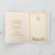 Inside, the card opens to reveal the full Hail, Holy Queen prayer, thoughtfully arranged on a gentle Marian damask background inspired by historic church textiles. An elegant Auspice Maria monogram crowns the opposite panel, accompanied by coordinating florals that echo the front design in a restrained and prayerful manner.