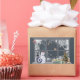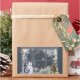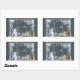 A pretty image with two kitty cats looking out a pained window at huge snowflakes with a Christmas tree and holiday presents and ornament decorating the window. A little yellow bird sits on the middle pane looking at the holiday warmth