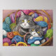 This poster captures a heartwarming scene featuring two adorable cats nestled in a cosy basket, surrounded by a tangle of colourful wool.