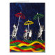 Whimsical illustration by Louis Wain of cats walking in the rain carrying colourful umbrellas.