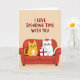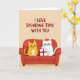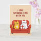 This cite cat card shows two cartoon cats sitting close together on a cherry-red sofa, set against a light beige background. The cat on the left is sunny yellow with small brown stripes and rosy cheeks, looking calm with half-closed eyes. Next to it, a white cat with pink cheeks has its eyes closed and holds a small gift box tied with a red ribbon, like it’s ready to give it to someone special ❤️. The sofa fills the lower part of the image, making the cozy scene feel front and center. At the top, the message “I LOVE SPENDING TIME WITH YOU” appears in rounded red letters that are easy to read. The reds from the sofa, ribbon, and text stand out nicely against the soft background, and the cats’ gentle expressions add a sweet, caring mood 💌🍫. Hope it helps you share a little extra love and kindness this Valentine’s Day.
