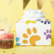 A vibrant and playful cartoon pattern featuring an array of colourful cat faces, paw prints, and playful text elements. The cat faces are depicted in various colours such as yellow, blue, purple, and peach, each with distinct expressions and features like whiskers, round eyes, and small noses. Interspersed among the cat faces are paw prints in a rainbow of colours including blue, orange, red, purple, and green, adding to the whimsical nature of the design. The words "MEOW!" and "PURRR" are scattered throughout the pattern in bold, cartoonish fonts, enhancing the overall playful theme. The background is a clean white, which allows the colourful elements to pop and creates a cheerful and engaging visual experience.
