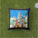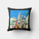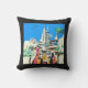 Throw pillow in an illustration of three stylish, cats dressed as tourists standing before a futuristic cityscape. The architecture evokes mid-century sci-fi aesthetics. The cats hold cameras, maps, and wear lanyards, suggesting adventure. Palm trees and a bright blue sky enhance the vacation atmosphere.