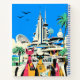Journal in an illustration of three stylish, cats dressed as tourists standing before a futuristic cityscape. The architecture evokes mid-century sci-fi aesthetics. The cats hold cameras, maps, and wear lanyards, suggesting adventure. Palm trees and a bright blue sky enhance the vacation atmosphere.