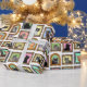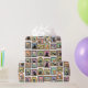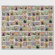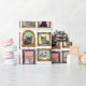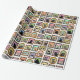 An assortment of distinctive cat head pictures in wooden frames on this colourful wrapping paper.