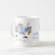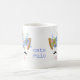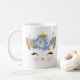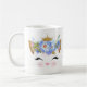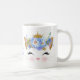Cat lovers ceramic mug, with pretty graphics of a cartoon cat face with big eye lashes, and a golden crown with blue flowers. Text, on the front of the mug reads cats rule, and can be personalised to read what you want.