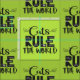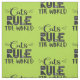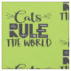 A trendy and lovely pattern featuring the words "Cats rule the world" in black font, decorated with white whiskers, cat scratches, a tiny mouse, and a little paw, on a bright green background.