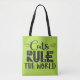 Trendy and lovely modern bright green tote bag featuring the words "Cats rule the world", decorated with white whiskers, cat scratches, a tiny mouse, and a little paw.