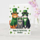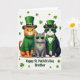 This card shows three dressed-up cats centered on a white background sprinkled with tiny shamrocks, setting a light St. Patrick’s Day scene 💚. On the left, a ginger cat in a green top hat with a gold buckle and a cable-knit green sweater smiles with bright green eyes, angled slightly toward the others like it’s sharing a private joke. In the middle, a smaller fluffy gray kitten wears lime-green sunglasses and a small shamrock on its chest, leaning in close to the group with a friendly, “we’re in this together” pose ☘️. On the right, a black cat wears a black suit with a green waistcoat and matching bow tie, topped with its own hat and green shades, standing near the kitten as if posing for a photo with close friends. Soft light brings out the fur texture and the knit and suit details, while the trio’s relaxed expressions suggest an easy closeness. Beneath the illustration, the message “Happy St. Patrick’s Day Brother” sits in green lettering along the lower area of the card. The cats’ outfits echo shades of emerald and lime against the white shamrock-speckled backdrop, with the hats, sunglasses, and gold buckle adding small points of contrast.