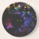 A custom sandstone coaster that features a black fractal cat surrounded by colorful leaves.