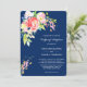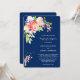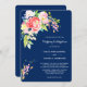 A bright and colourful floral and cattail bouquet is at the top left corner of this pretty wedding invitation. Colours in the bouquet include coral pink, light violet pink, white, pale yellow and gold, and green, with a touch of aqua blue. The bottom left has another image of the violet ink and gold cattails. Your custom text is in white at the right of the card. All is placed on a medium navy blue background, and the back of the invitation is also blue. Appropriate for weddings in any season! You may also change the background and text colours by choosing "Customise It." This design looks spectacular on black!