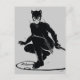 This striking graphic captures Catwoman in her element, showcasing her agility and stealth as she prepares for action. The illustration is rendered in bold black and white, emphasising the sleekness of her costume and the dynamic movement of her pose. Catwoman is depicted crouching with a whip coiled at her side, her gaze focused and calculating. The splattered ink effect around her adds a sense of urgency and the chaotic environment in which she thrives. This artwork not only highlights Catwoman's iconic status as a skilled thief and anti-heroine but also her complex relationship with Gotham and its dark knight. It's a powerful portrayal of one of Batman's most enigmatic and formidable allies and adversaries.