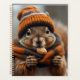 The design conveys a sense of cosiness, warmth, and perhaps a touch of whimsy, making the squirrel look ready for colder weather as it snacks away contentedly on autumns surplus supply of nutrition. The background is softly blurred, with muted greens and browns.