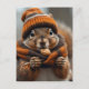 The design conveys a sense of cosiness, warmth, and perhaps a touch of whimsy, making the squirrel look ready for colder weather as it snacks away contentedly on autumns surplus supply of nutrition. The background is softly blurred, with muted greens and browns.