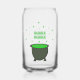 This awesome can glass features a graphic image of a grey cauldron. The cauldron is full to the top with a green potion brewed by a witch. The potion is bubbling out of the cauldron and has formed the word "bubble" which appears twice above the poisonous looking brew.
