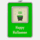 This awesome ornament features a graphic image of a grey cauldron. The cauldron is full to the top with a green potion brewed by a witch. The potion is bubbling out of the cauldron and has formed the word "bubble" which appears twice above the poisonous looking brew.