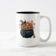 Cauldron Of Giggle & Gummies Mug. A cheerful cauldron beams, stuffed with candies exploding like confetti, proudly sporting a witch hat. Its broomstick buddy leans close, clearly waiting for sweet-fueled liftoff, Halloween’s happiest sugar-powered witch-mobile!