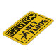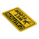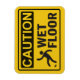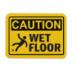 Caution Wet Floor door sign with icon of person falling. Caution yellow and black magnet to be used on a door when a room has been cleaned or mopped or had a spill. Easy to move magnet makes a convenient warning sign for restroom cleaning.