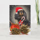 Beautiful black and brown Cavalier King Charles is a Christmas Card design that features King Charles decked in Santa hat with large candy cane against backdrop of night skies and white snow.