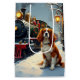 A nostalgic and heartwarming Christmas painting of a Cavalier King Charles Spaniel waiting at a snowy train station. Perfect for those who love vintage holiday charm and timeless festive art.