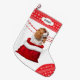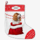 The front of this Holiday stocking shows an image of an adorable Cavalier King Charles Spaniel dog peeking out of a red and white Santa style gift bag. Behind the dog is a red beaded garland. The toe and top border are a red and white snowflake pattern. On the top border is a white label with your custom text in dark grey. The back of the stocking is the same red and white snowflake pattern.