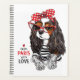This design features a Cavalier King Charles Spaniel dog dressed in a striped cardigan, red sunglasses and with a polka dot headband.