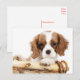 This fun canine postcard features an image of baby Cavalier King Charles Spaniel puppy dog in a wood basket highlighted against a crisp white background.