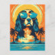 Colourful design of a Cavalier King Charles Spaniel wearing sunglasses at a tropical beach.