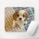 This is a Mousepad featuring an original photograph of a tiny, adorable Blenheim Cavalier King Charles spaniel puppy sitting on his favourite blanket.