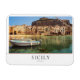 Photo souvenir magnet with two boats in the old small port of Cefalu, an old town with crooked houses on the waterfront and a small city beach on the north coast of Sicily, island in Italy with the text 'Sicily, Italy' in a white box and with stripes in green, white and red, the colours of the italian flag.