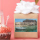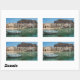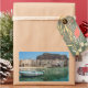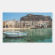 Rectangular photo sticker with two boats in the old small port of Cefalu, an old town with crooked houses on the waterfront and a small city beach on the north coast of Sicily, island in Italy.