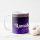 Purple and white Ramadan Mubarak coffee mug featuring mosque, Arabic pattern and "Ramadan Kareem, Happy Holy Month" written on purple background. Ideal gift for your loved ones.
