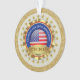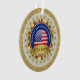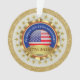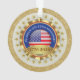 The ornament features a classic American flag centered within a bold royal blue ring. It is framed by a brilliant gold-style sunburst and an outer ring of 20 shimmering gold stars set against a textured glitter-style border, creating a high-quality, official appearance.