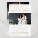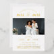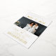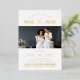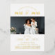 Gay sequel wedding invitation in white with golden fonts and your wedding photo. In an arch above gold foil mrs and mrs connected with intertwined hearts, celebrate with the new. Add your LGBT post wedding celebration details below and another wedding photo on the other side. White and gold foil lesbian wedding reception invitation in personalised with your wedding photos. Mrs & Mrs post elopement celebration invitation personalised with two photos.